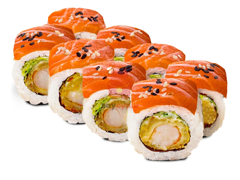 Рис, нори, креветки в темпуре, айсберг, чесночный соус, лосось, манго соус, кунжут