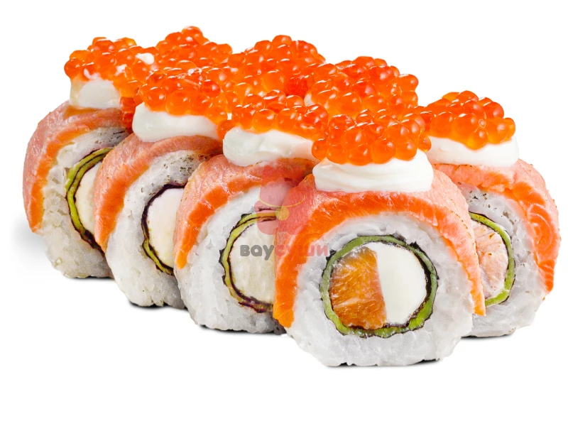 Состав: рис, нори, сыр, лосось, авокадо, сливочный мусс, икра лосося имитированная